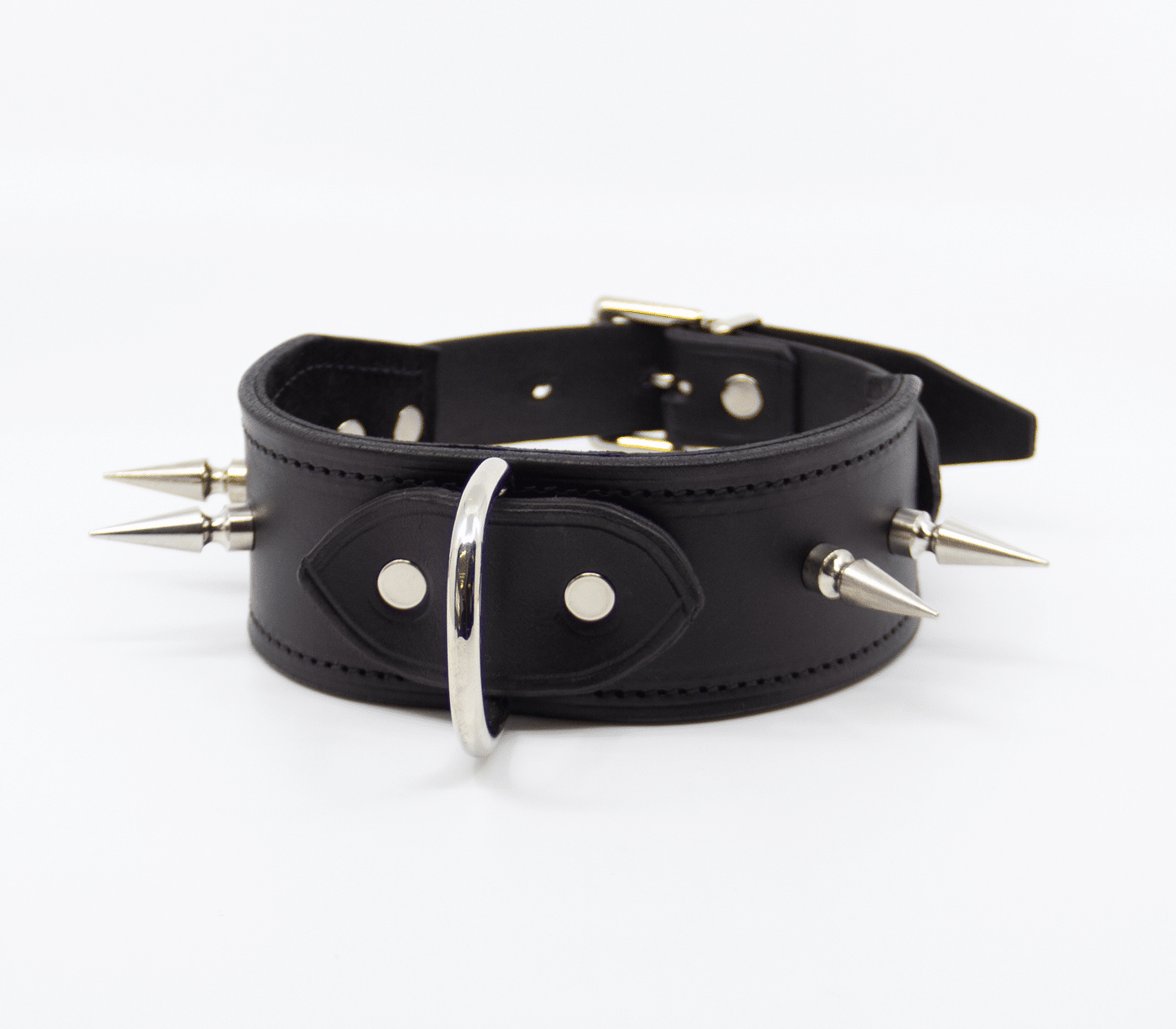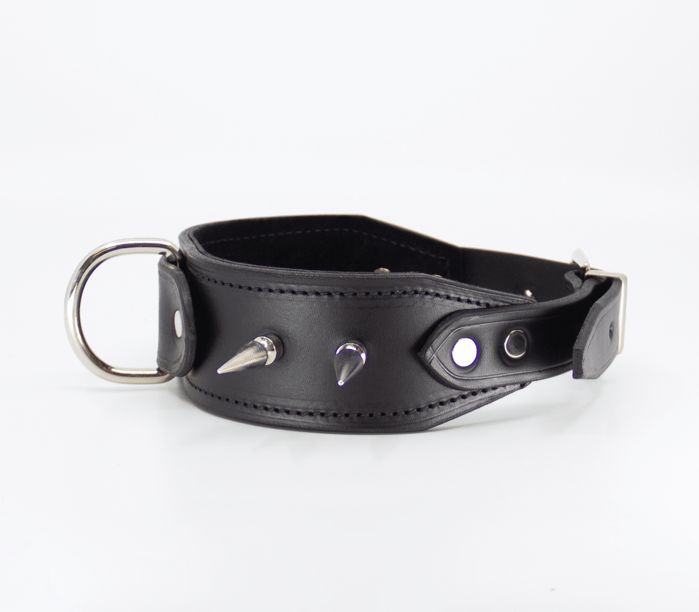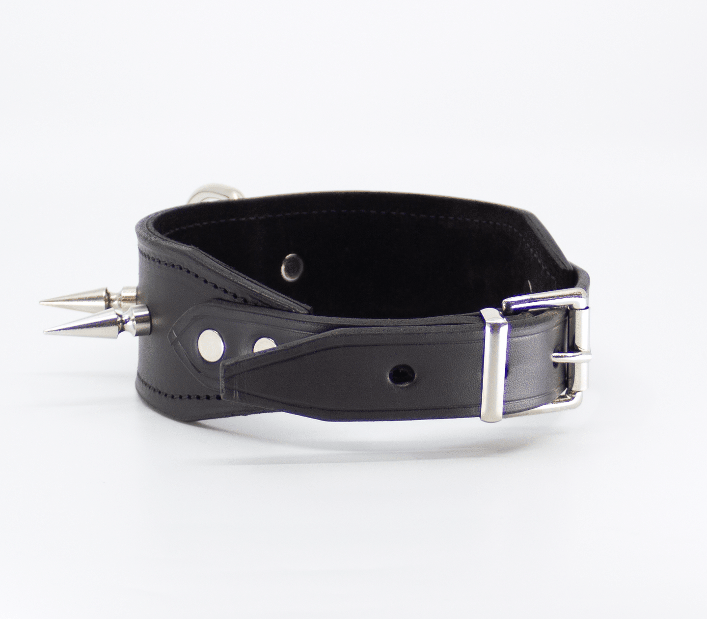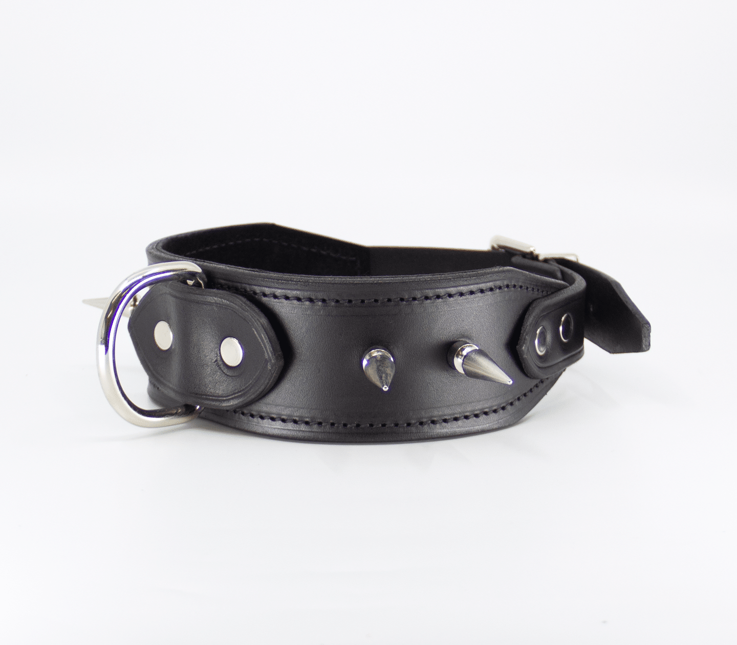 Unlined wide leather collar with long dog spikes. Hand crafted in Australia from the finest Italian leather. This collar features a centre dee to attach your choice of shackle or lead.