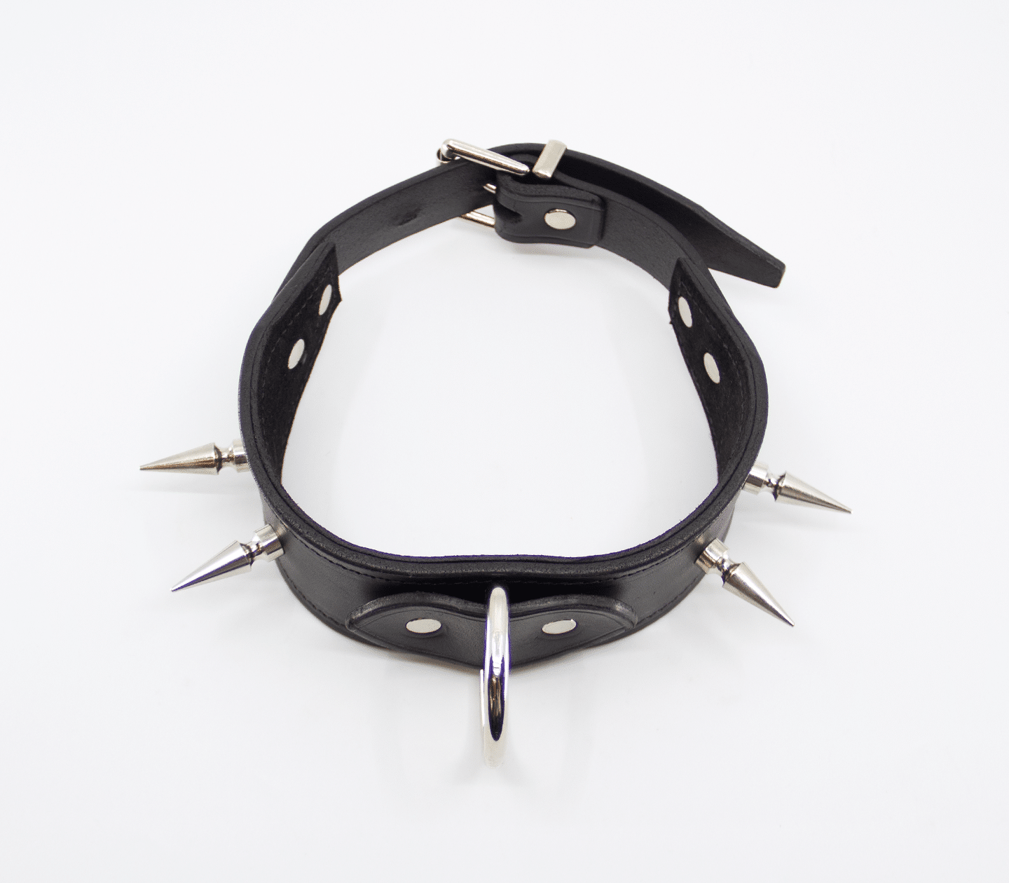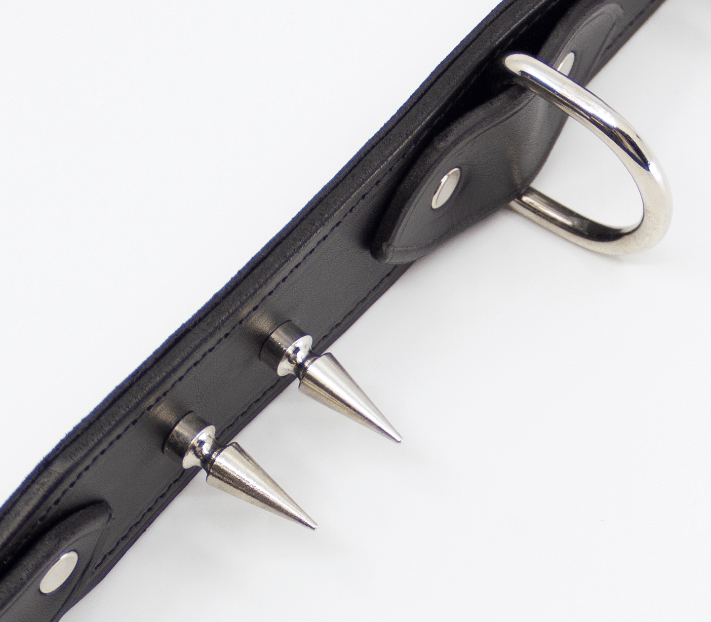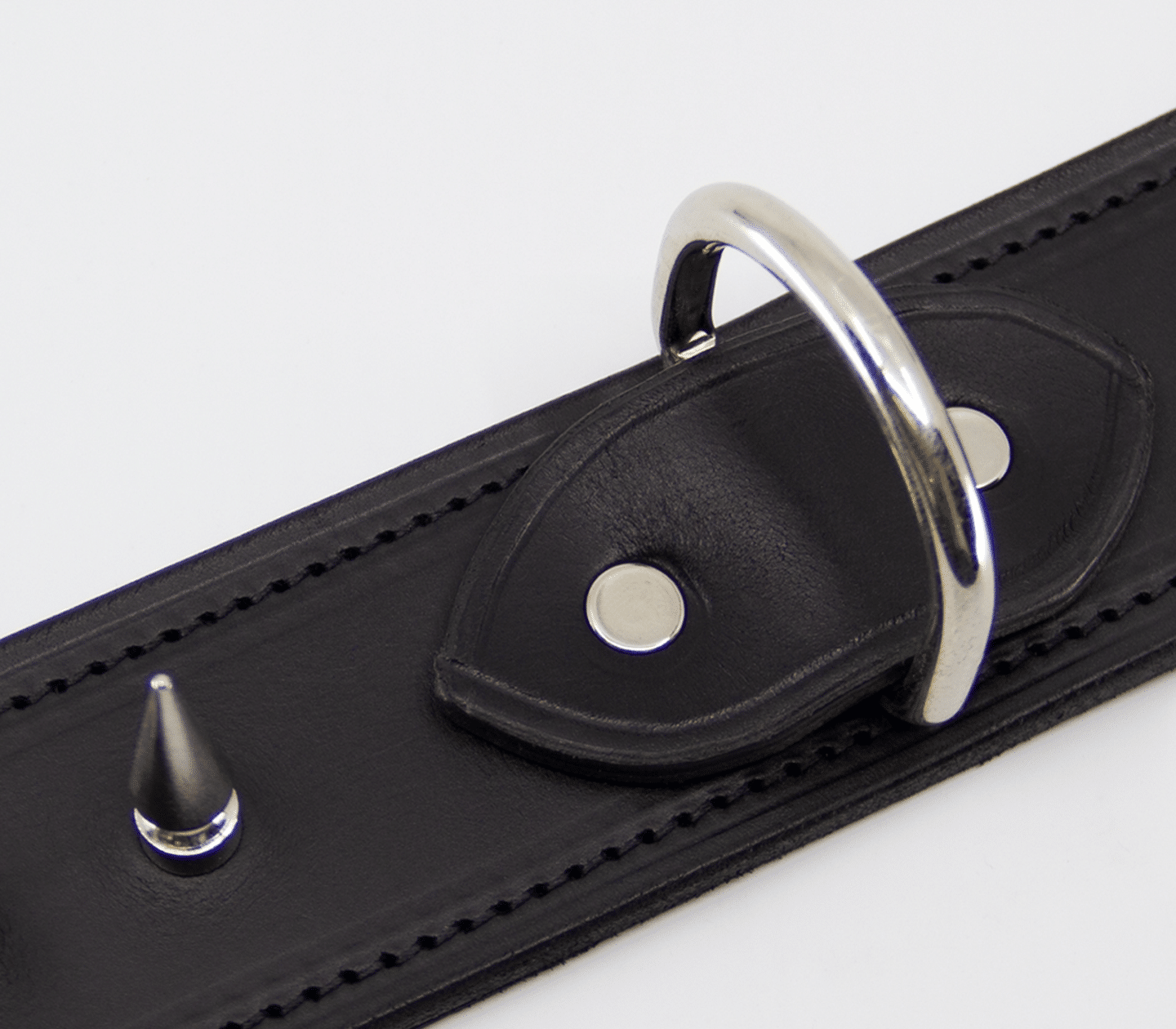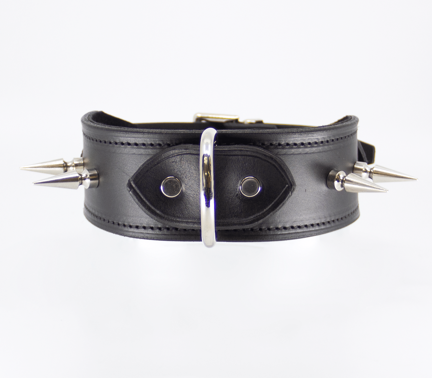 Unlined wide leather collar with long dog spikes. Hand crafted in Australia from the finest Italian leather. This collar features a centre dee to attach your choice of shackle or lead.