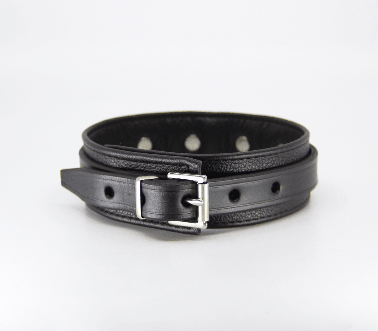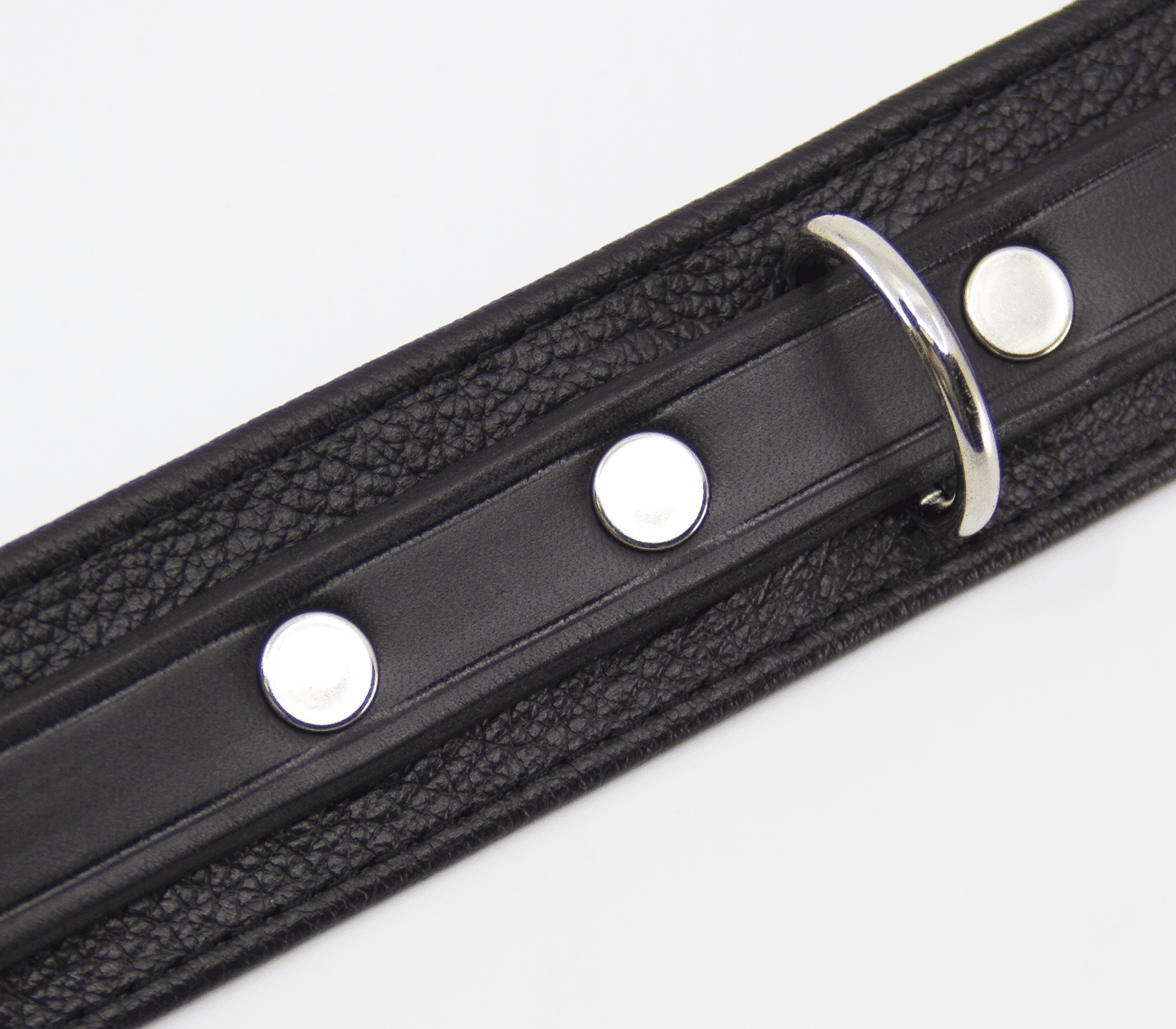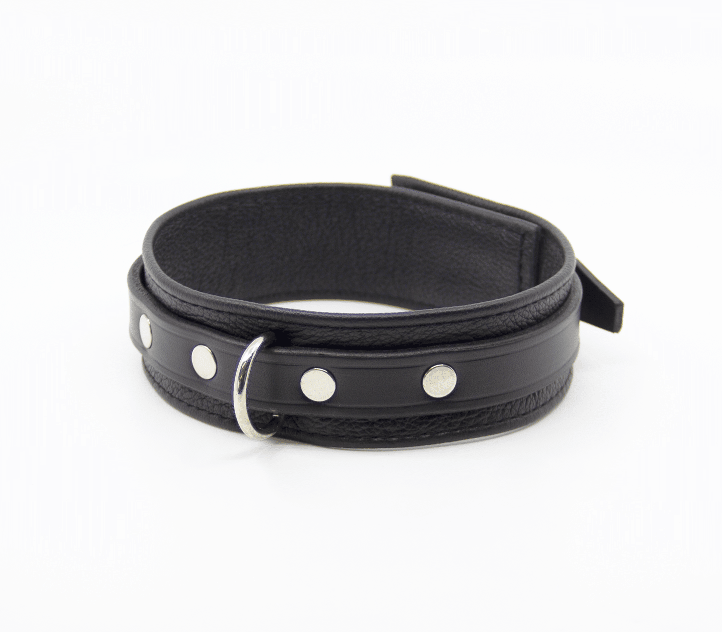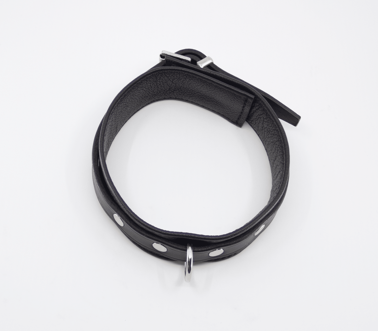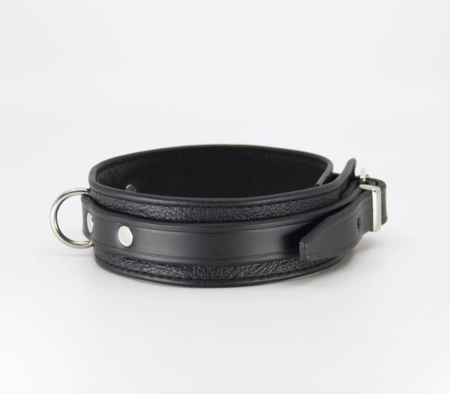 Soft, grained leather collar with contrasting flat leather strapping. Hand crafted in Australia from the finest Italian leather. Collar features a centre dee to attach your choice of shackle or lead.