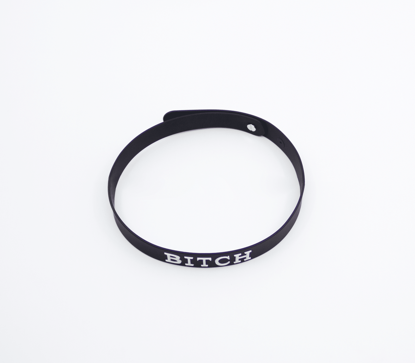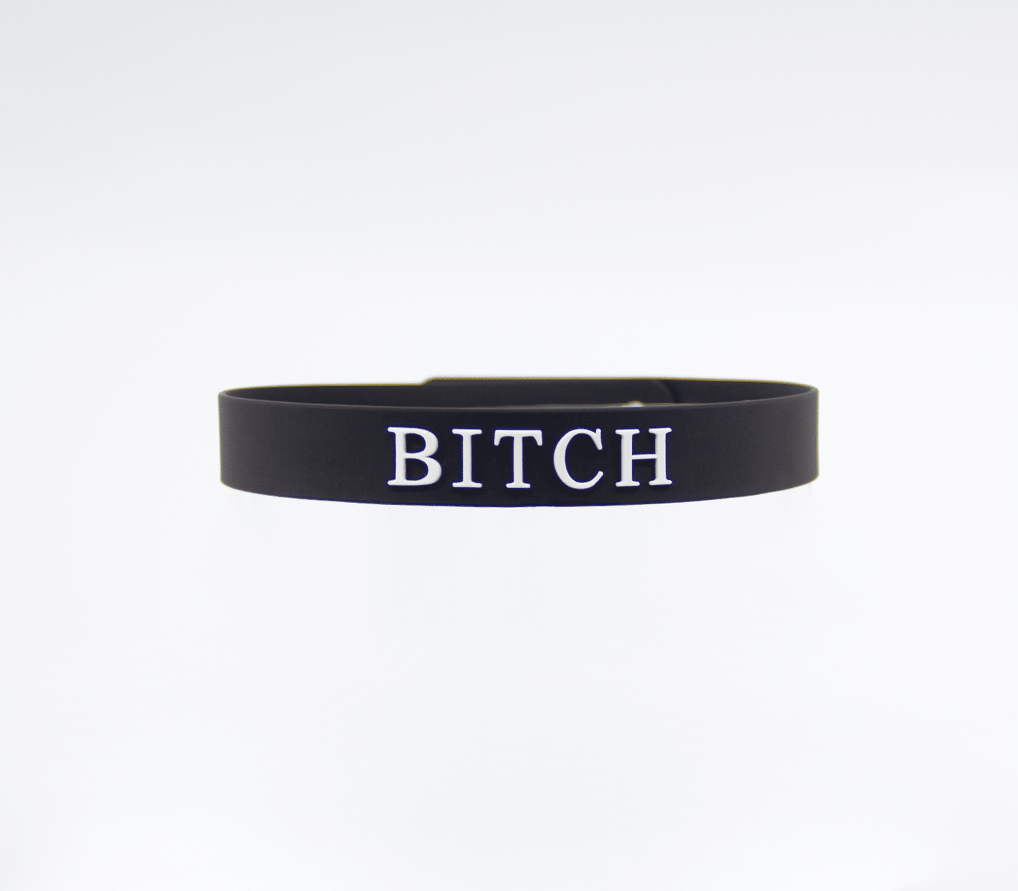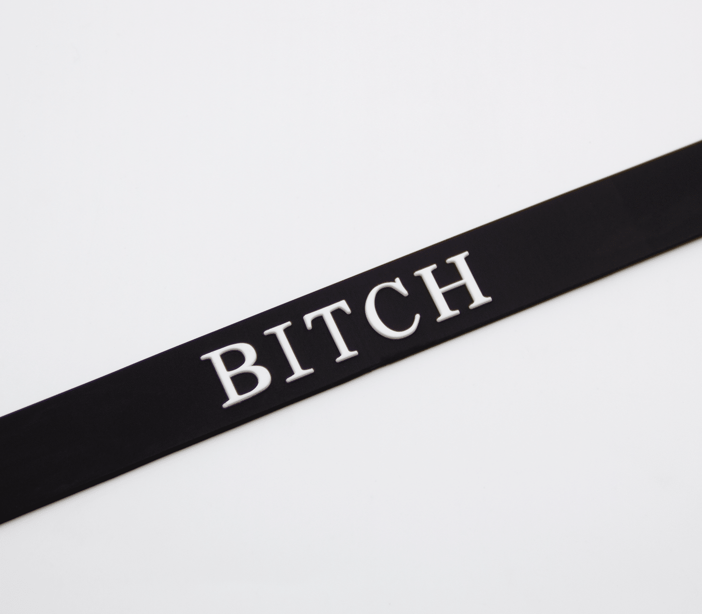 Dainty black silicone collar with raised white silicone lettering.