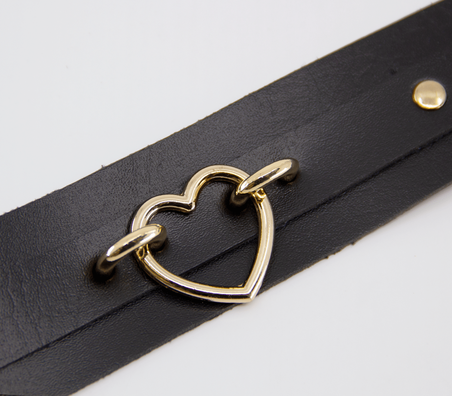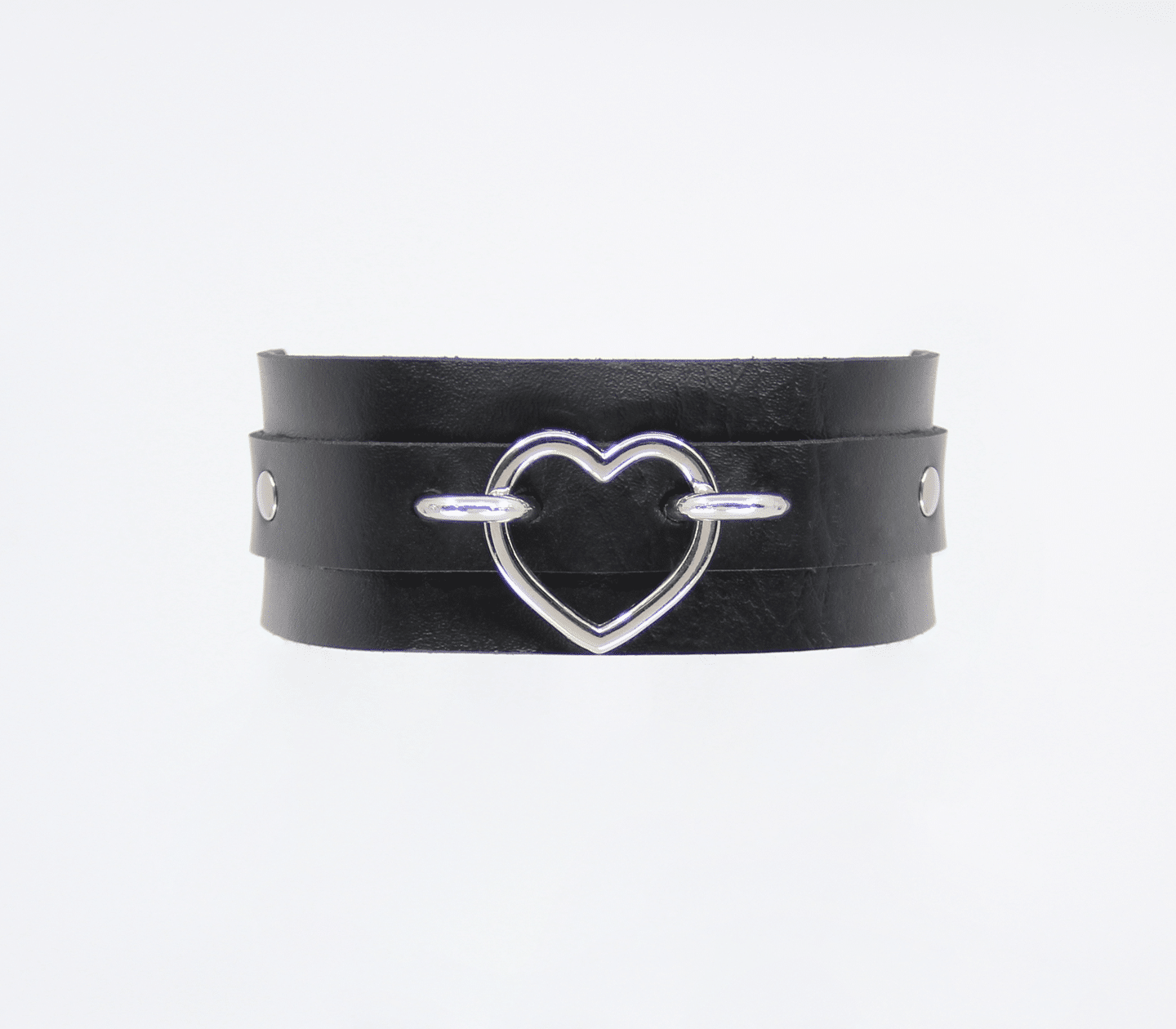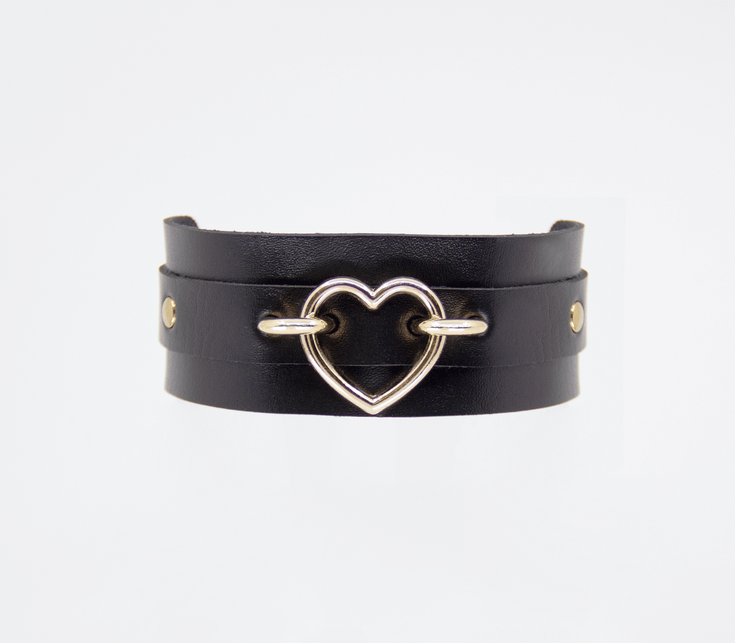 Unlined faux grained leather collar with heart shaped hardware embellishment. Hardware is available in 2 colours; gold & silver.