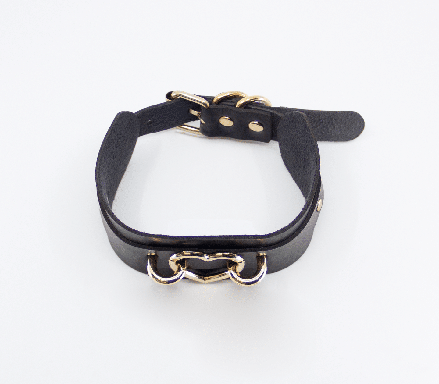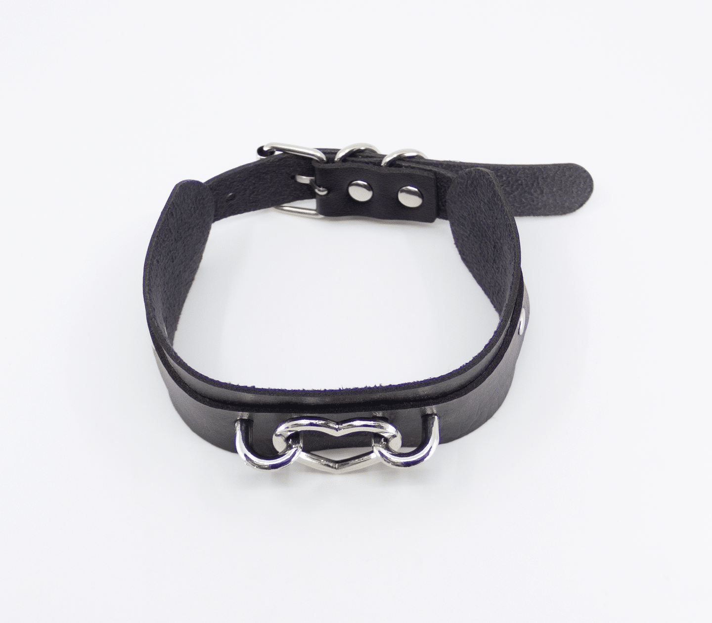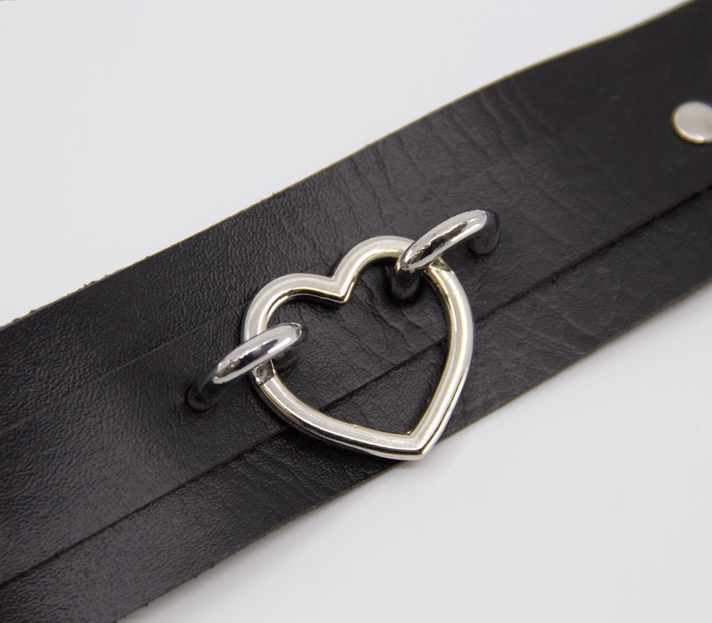 Unlined faux grained leather collar with heart shaped hardware embellishment. Hardware is available in 2 colours; gold & silver.