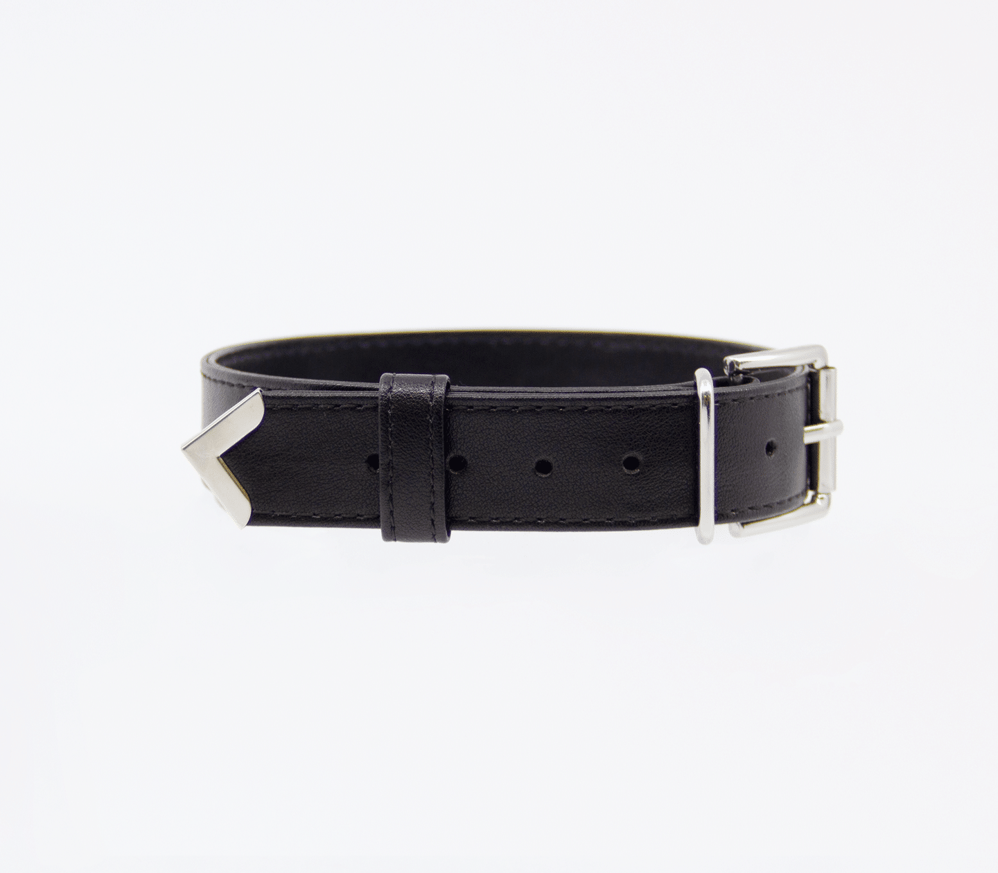 Lightly padded flat leather collar & lead set. Collar features a silver tip and centre dee. Centre dee is attached by rotating toggle hardware for complete freedom of movement. Why not make it a set? Matching wrist cuffs available.