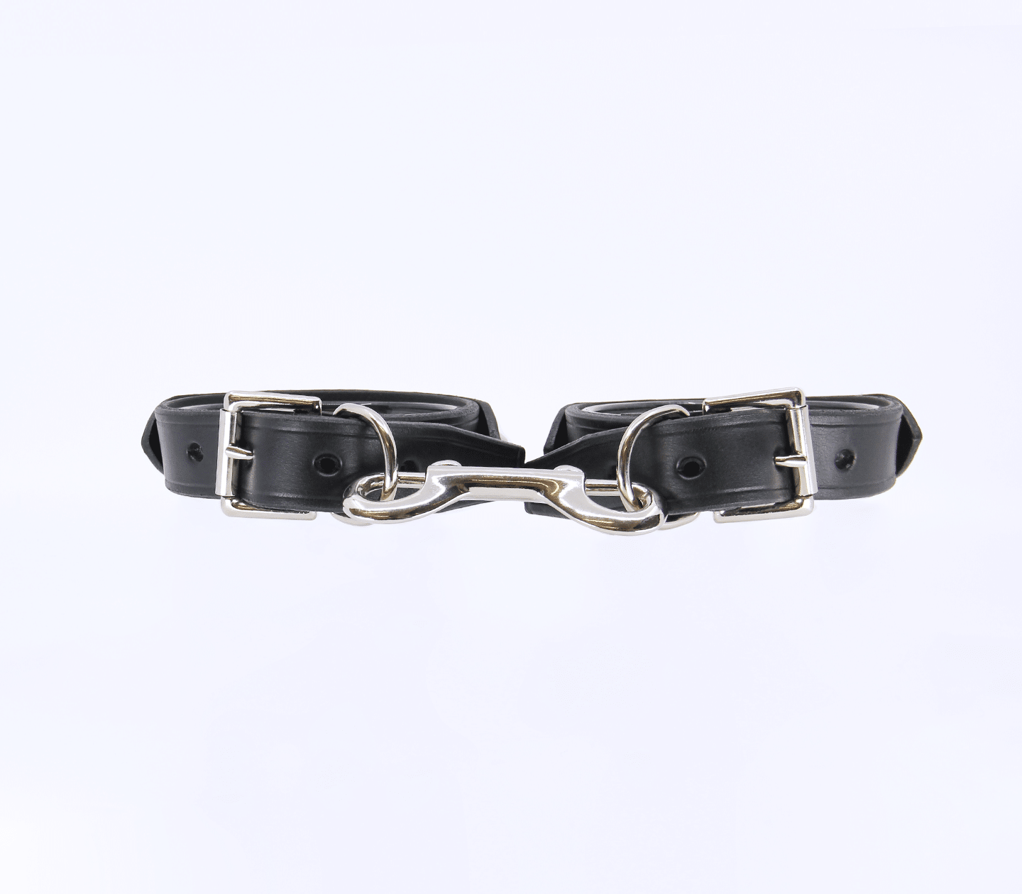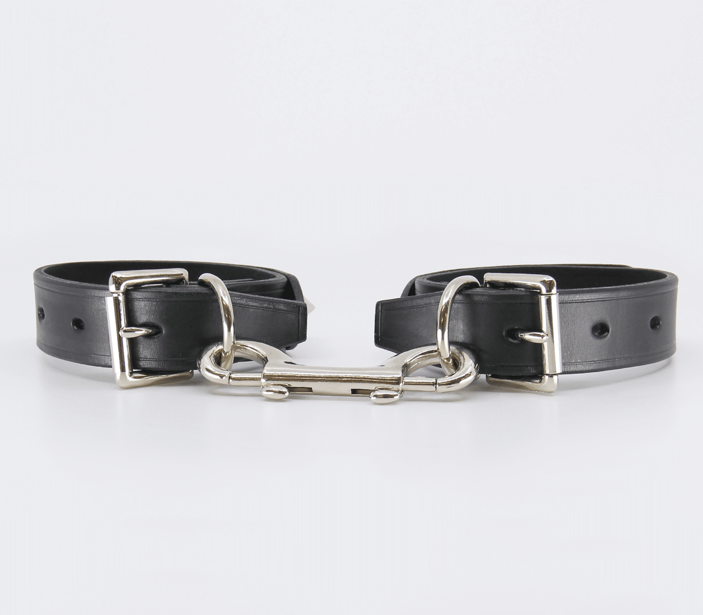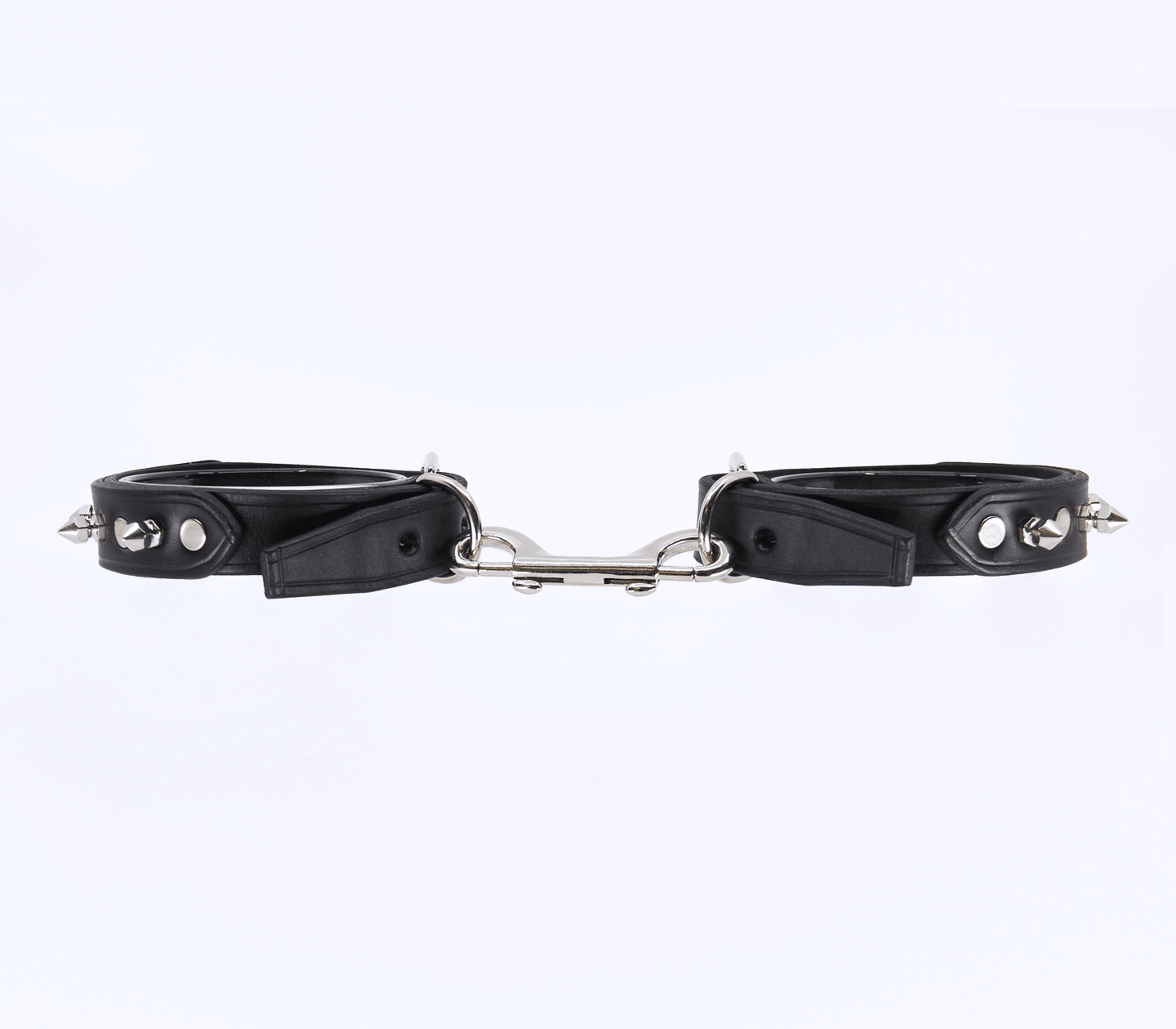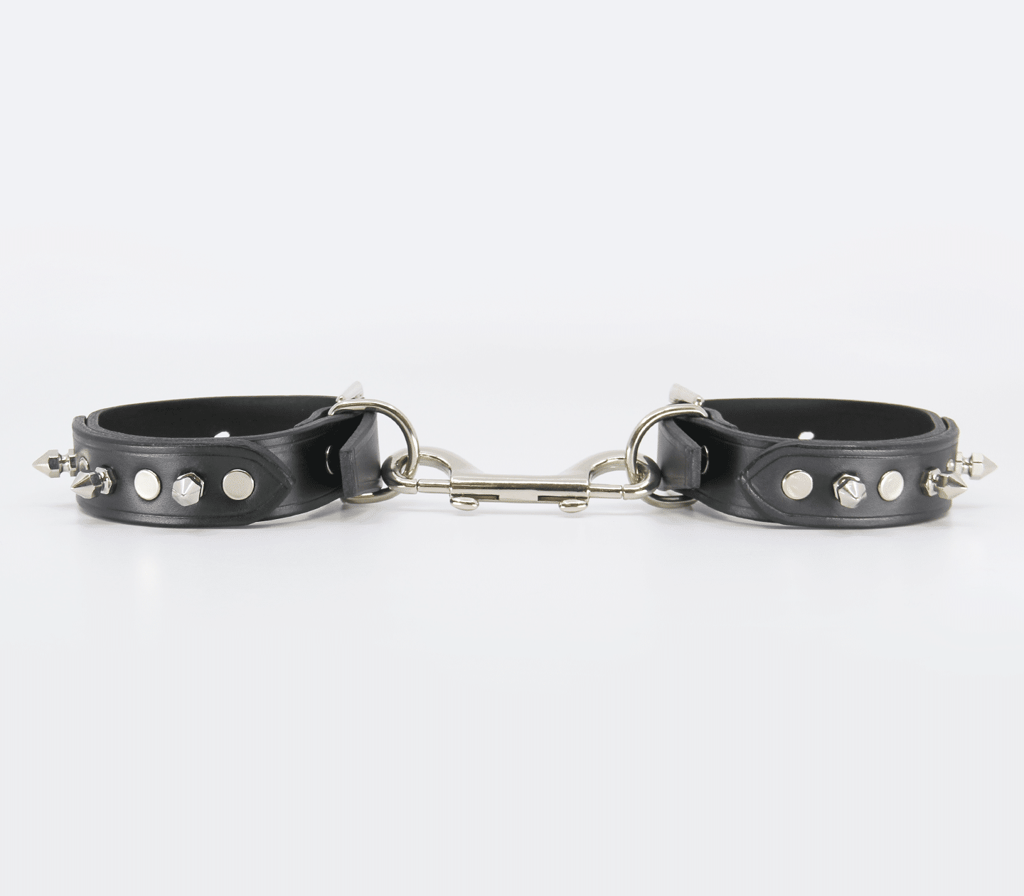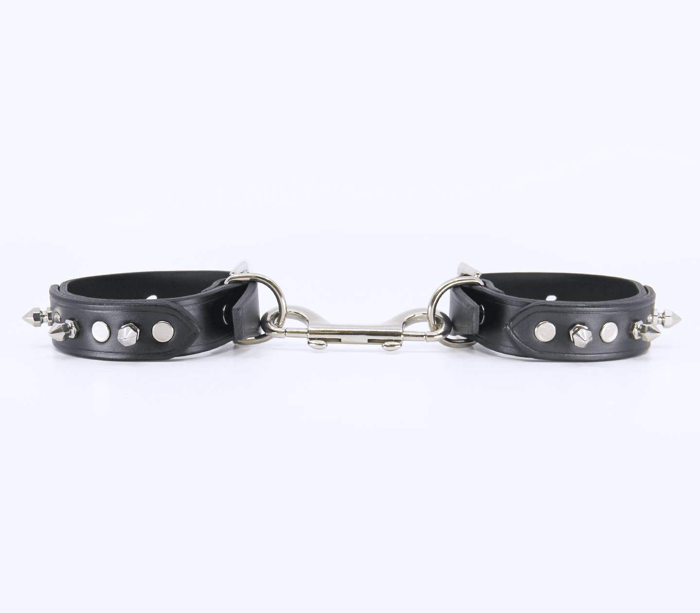 Unlined leather handcuffs with detachable double snap join & dog spikes. Hand crafted in Australia from the finest Italian leather. Each cuff sports a sturdy D-ring which can be used to connect your choice of chain or attach to a spreader bar.