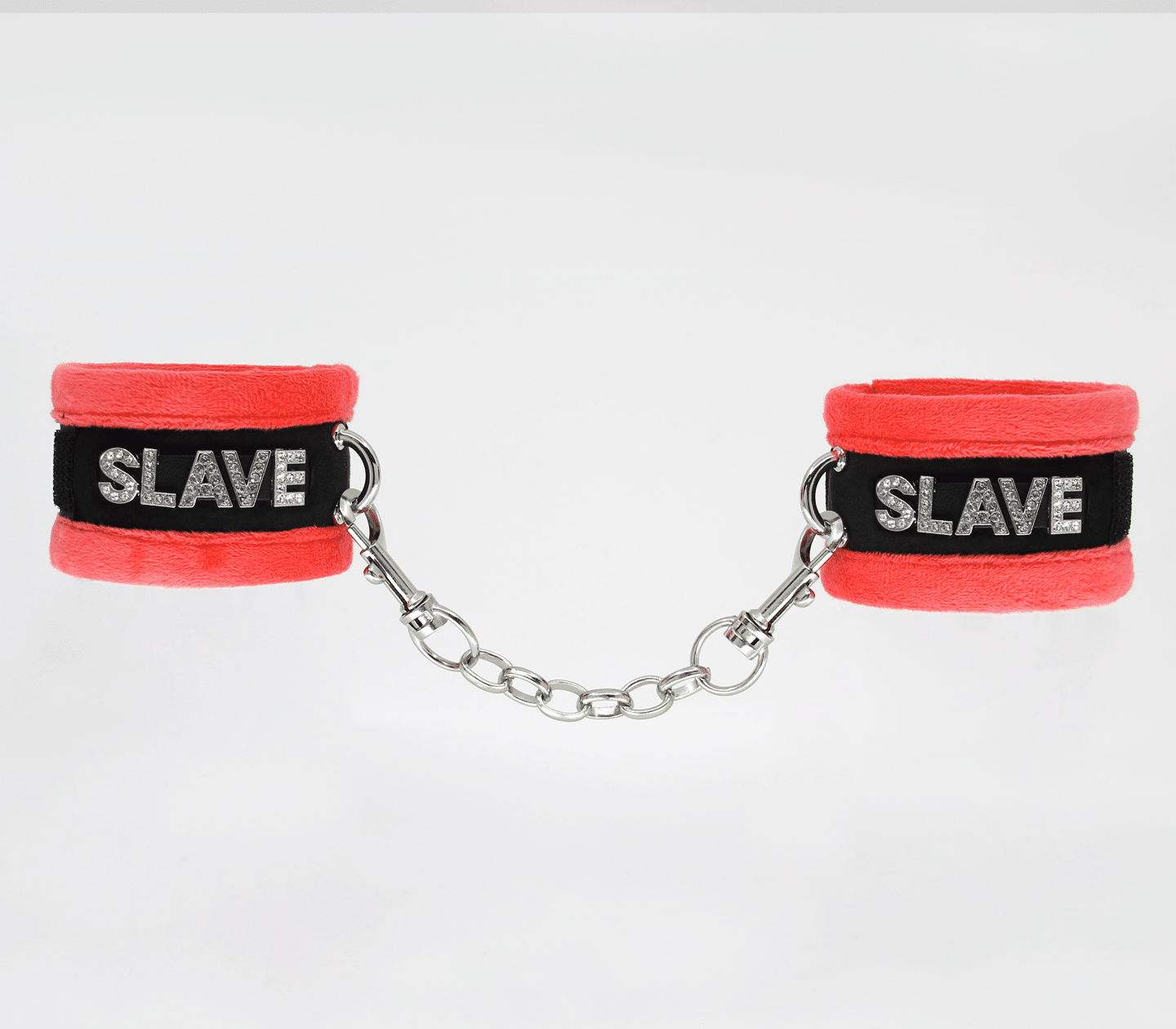 Soft & fluffy handcuffs embellished with the word ‘SLAVE’ in diamanté lettering. Cuffs feature Velcro fastening for the perfect fit & are attached by a double ended chain & snap join. Available in 3 colours; black, red & purple. Why not make it a set? These cuffs have a matching collar & blindfold.