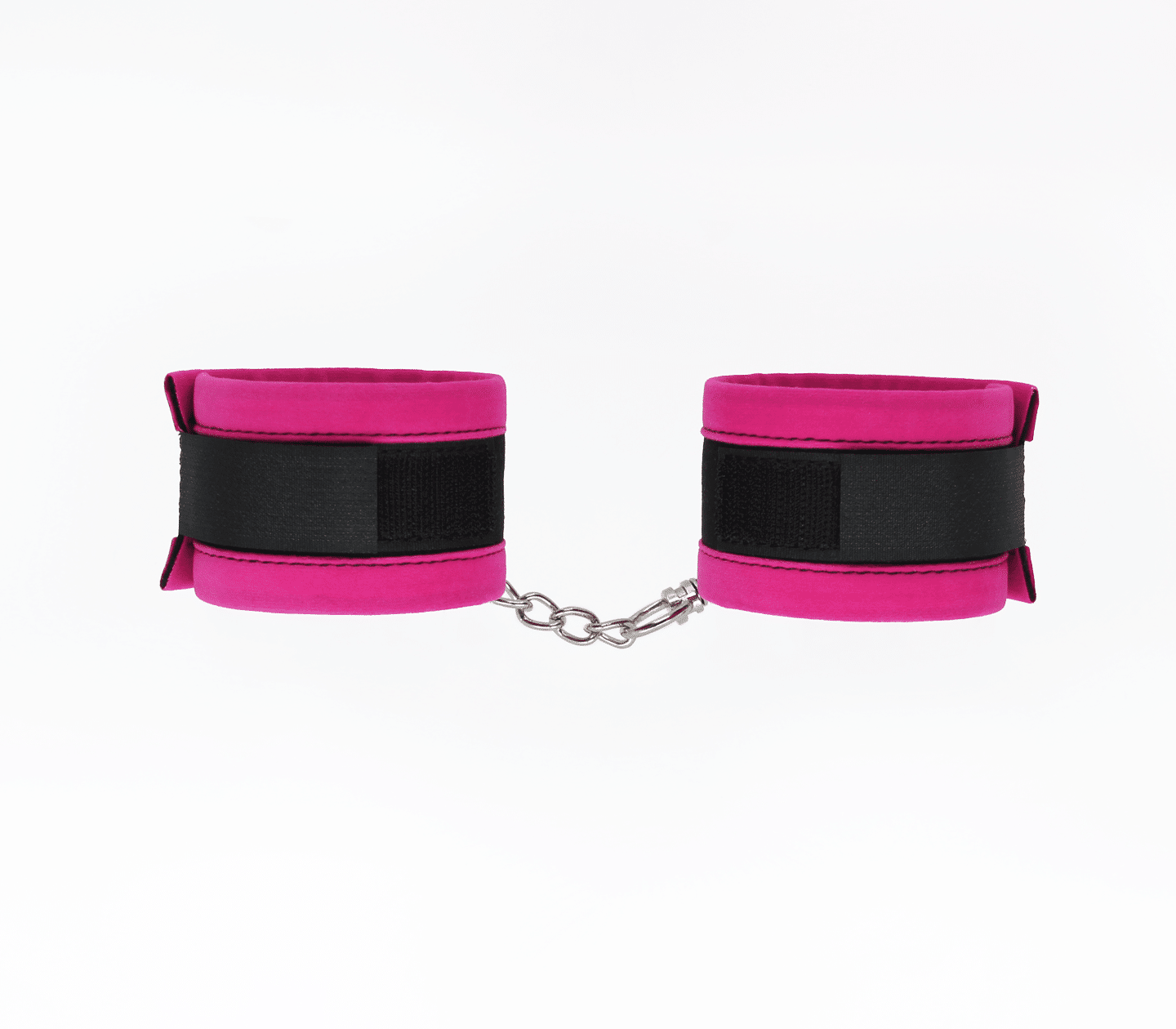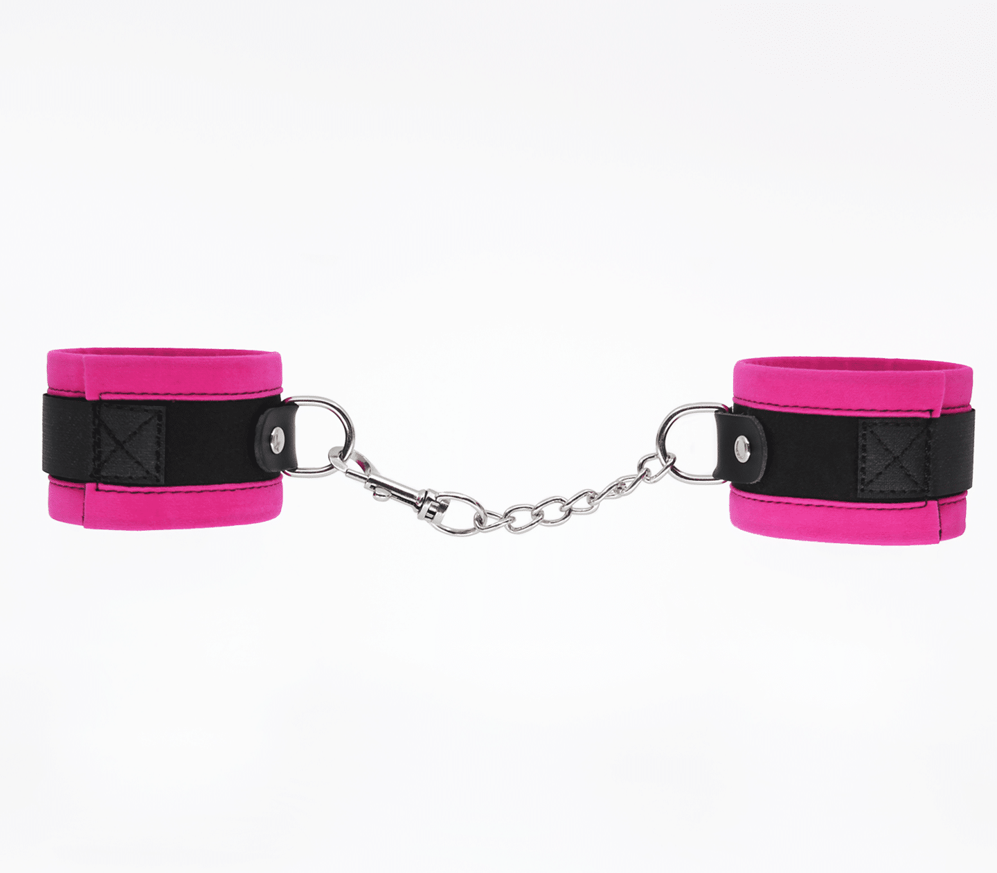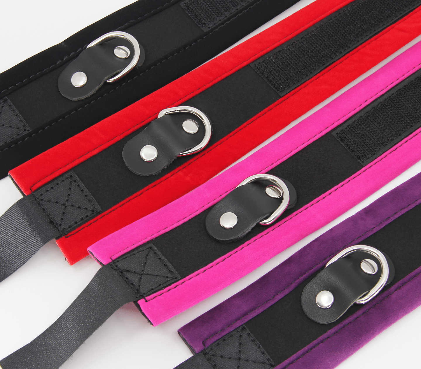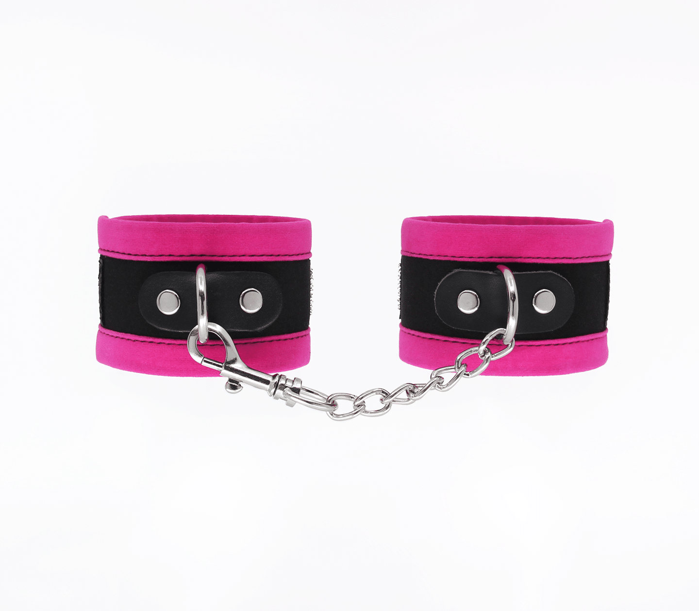 Lightly padded velveteen handcuffs. Cuffs feature Velcro fastening for the perfect fit & are attached by a single snap & chain join. Available in 4 colours; black, red, pink & purple. Why not make it a set? These cuffs have a matching flogger.
