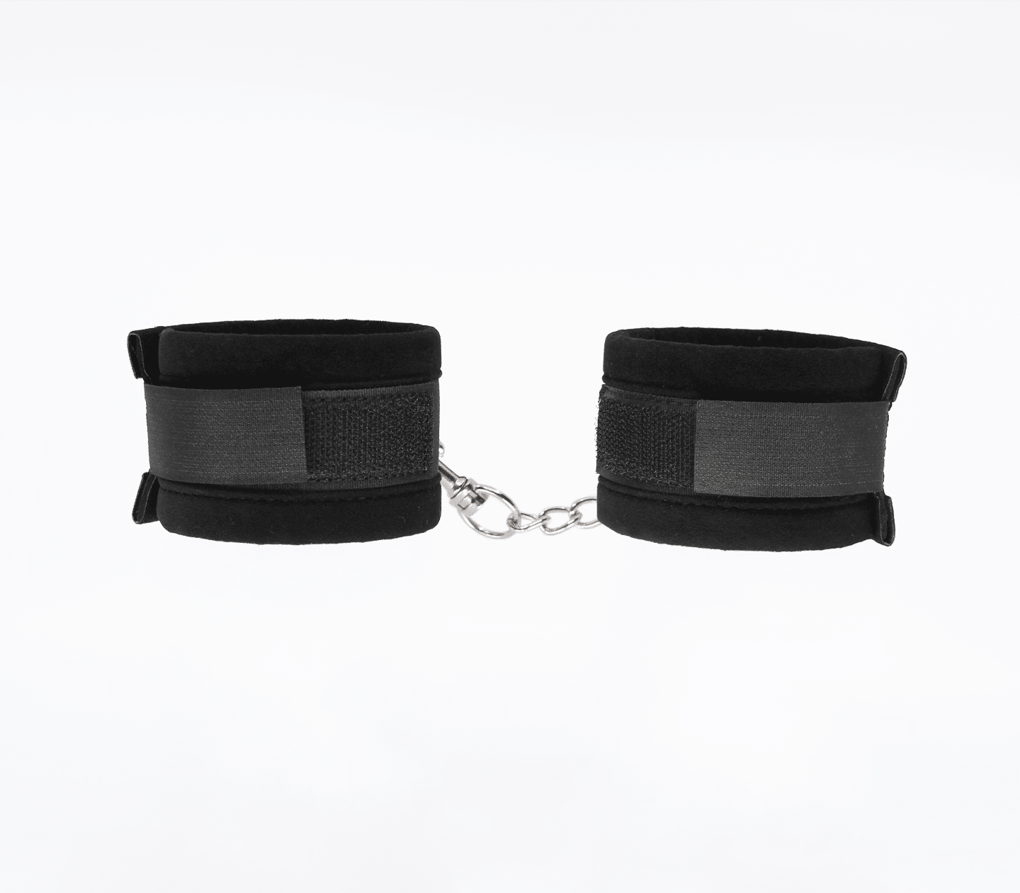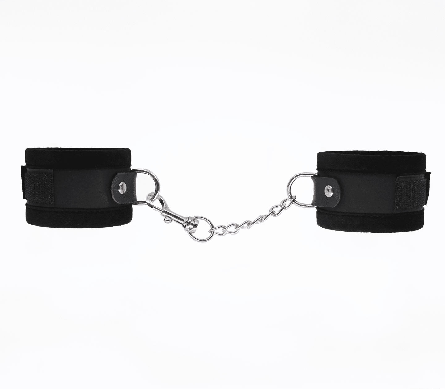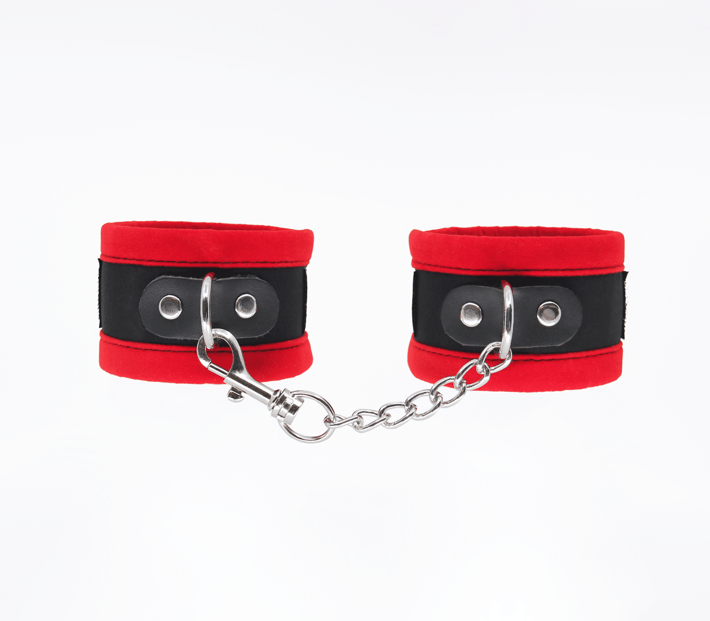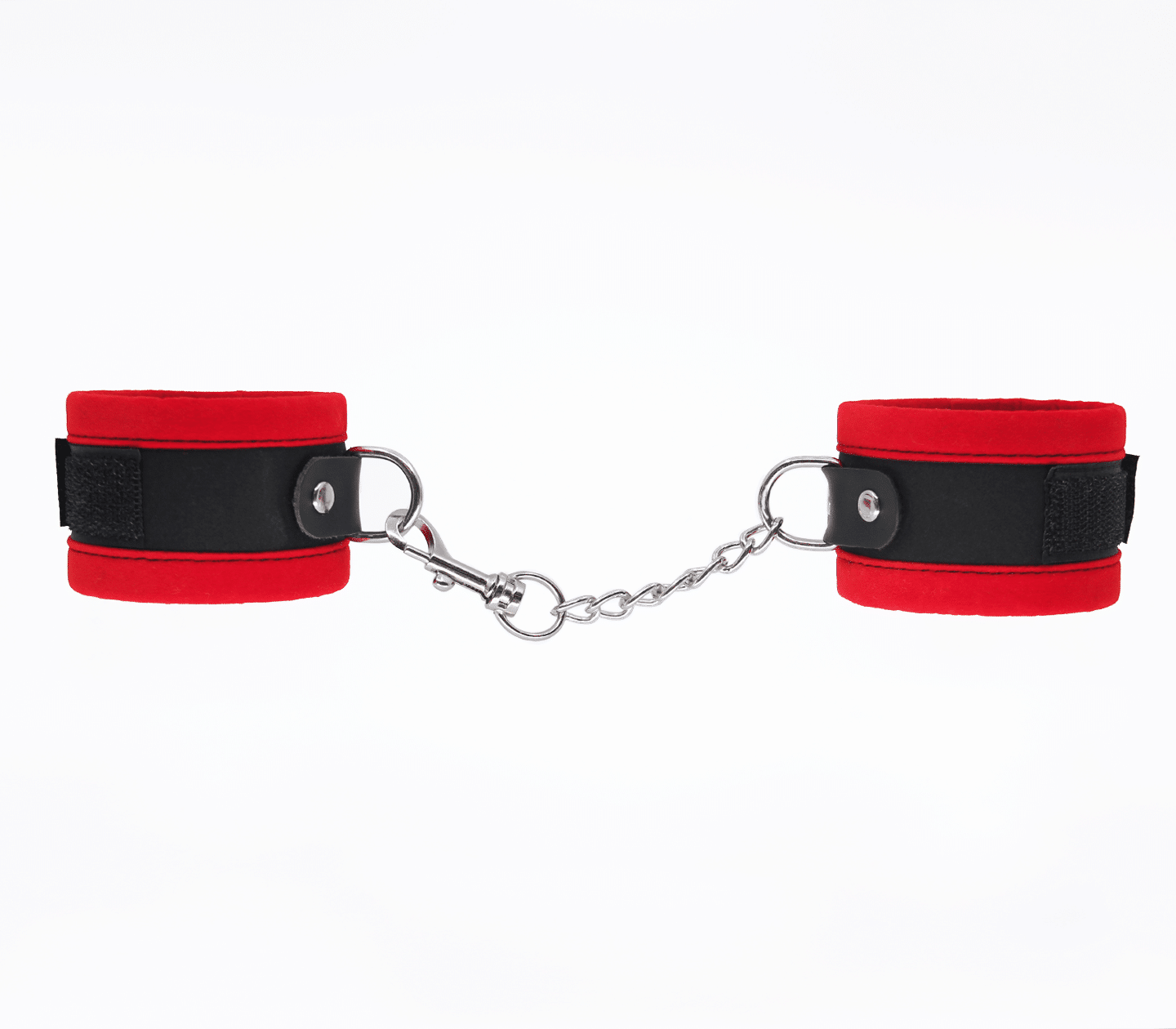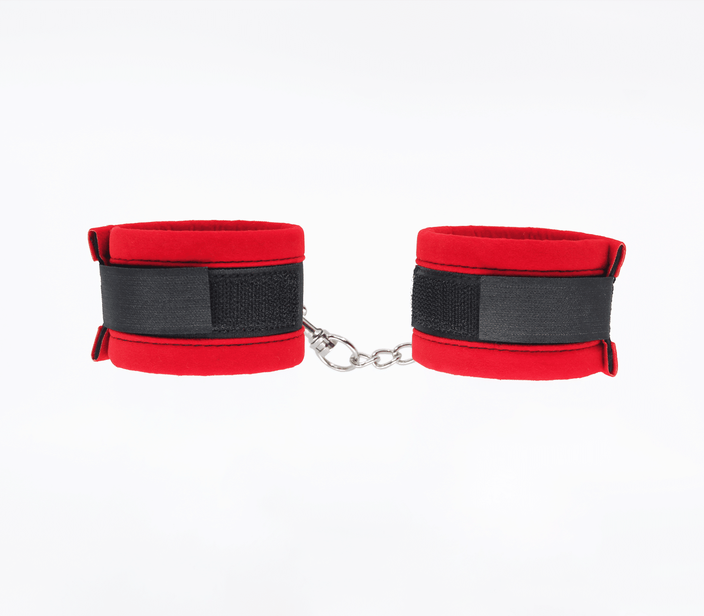 Lightly padded velveteen handcuffs. Cuffs feature Velcro fastening for the perfect fit & are attached by a single snap & chain join. Available in 4 colours; black, red, pink & purple. Why not make it a set? These cuffs have a matching flogger.