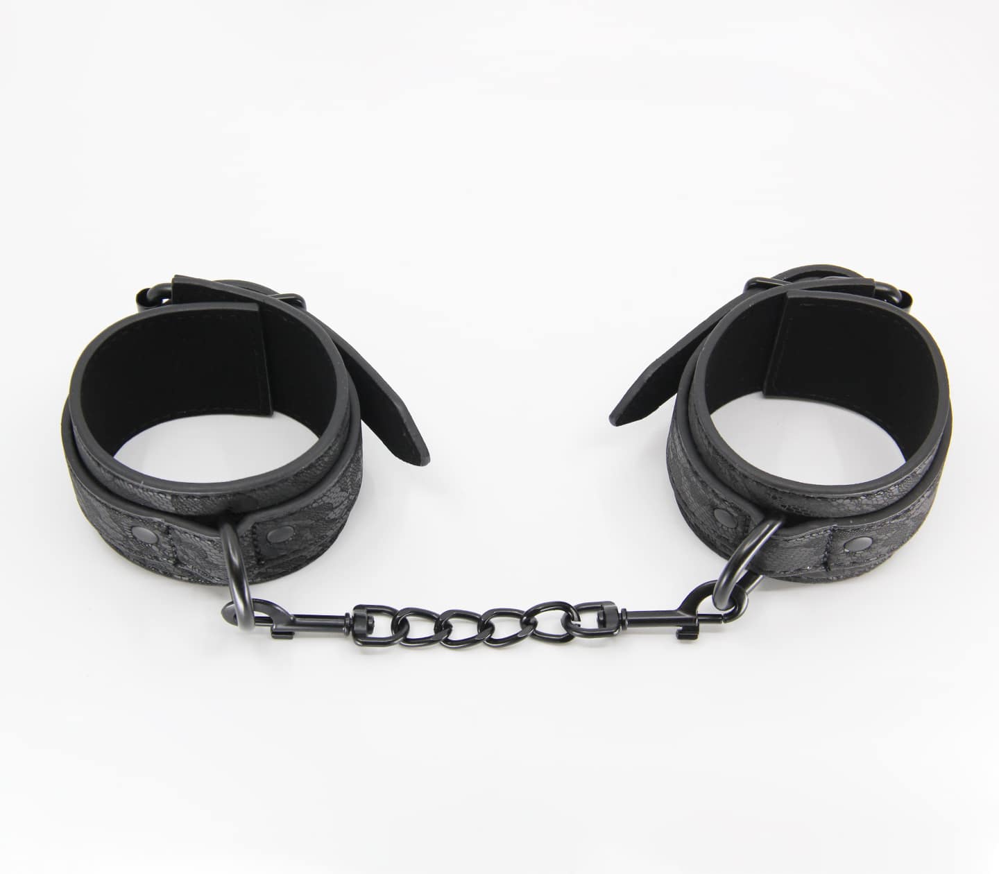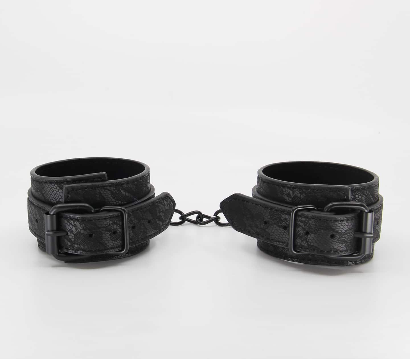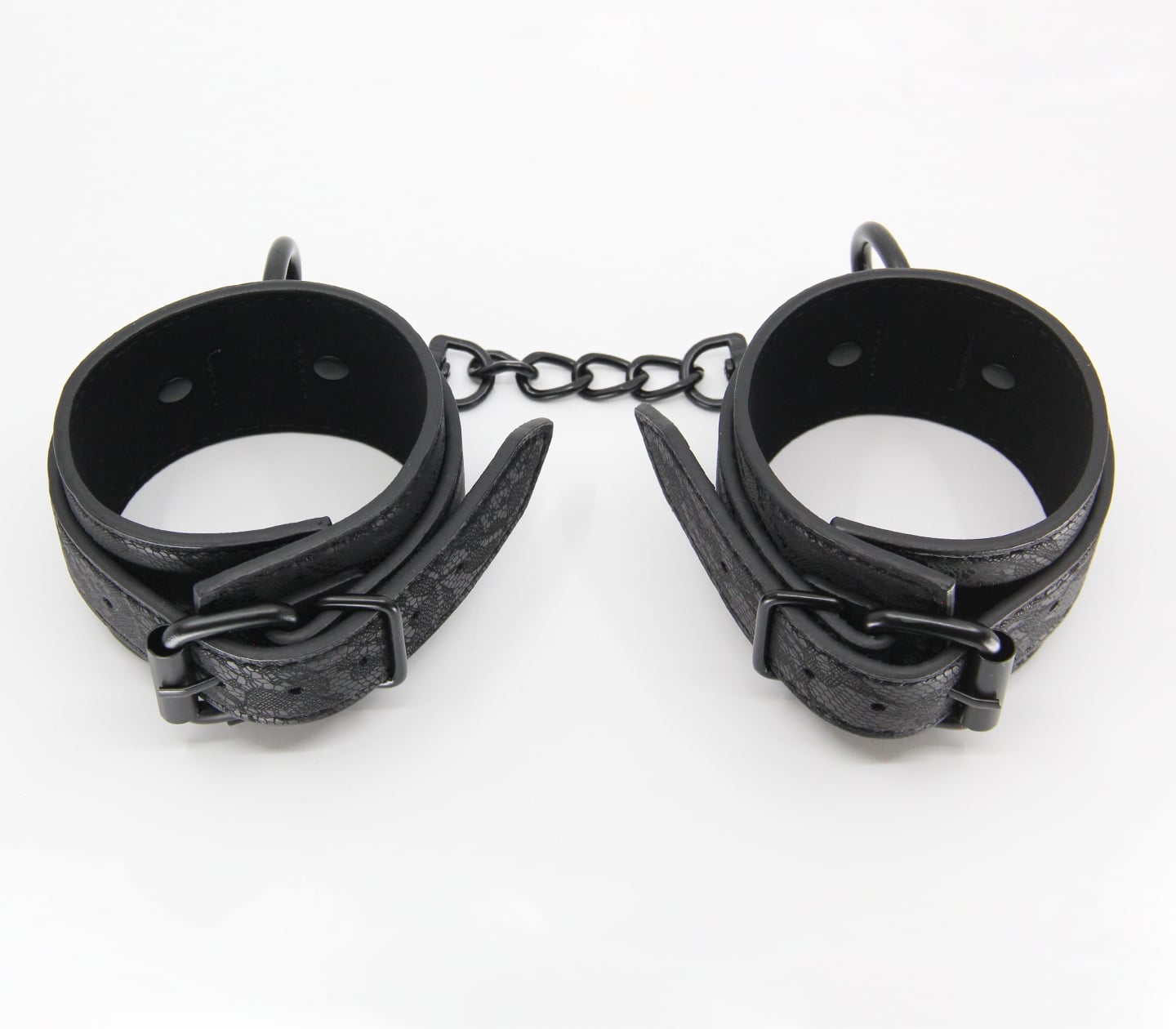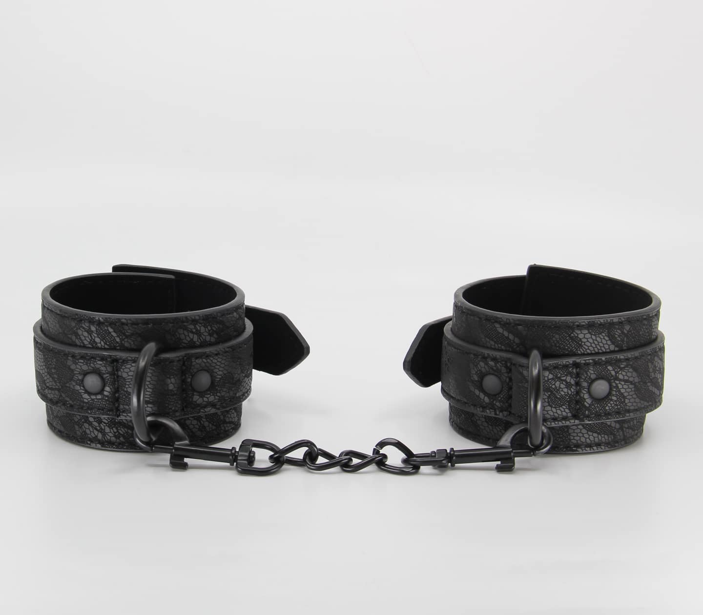 Login to see priceBlack lace printed wrist restraints with matte black hardware and chain join.