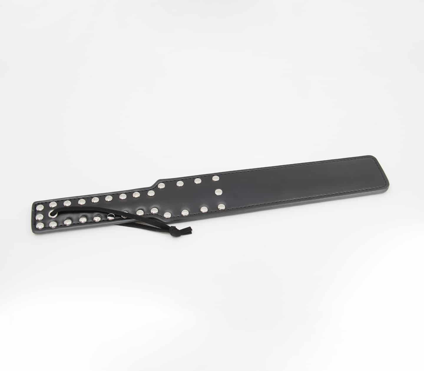 Login to see priceFaux leather paddle with decorative stud handle and wrist strap.