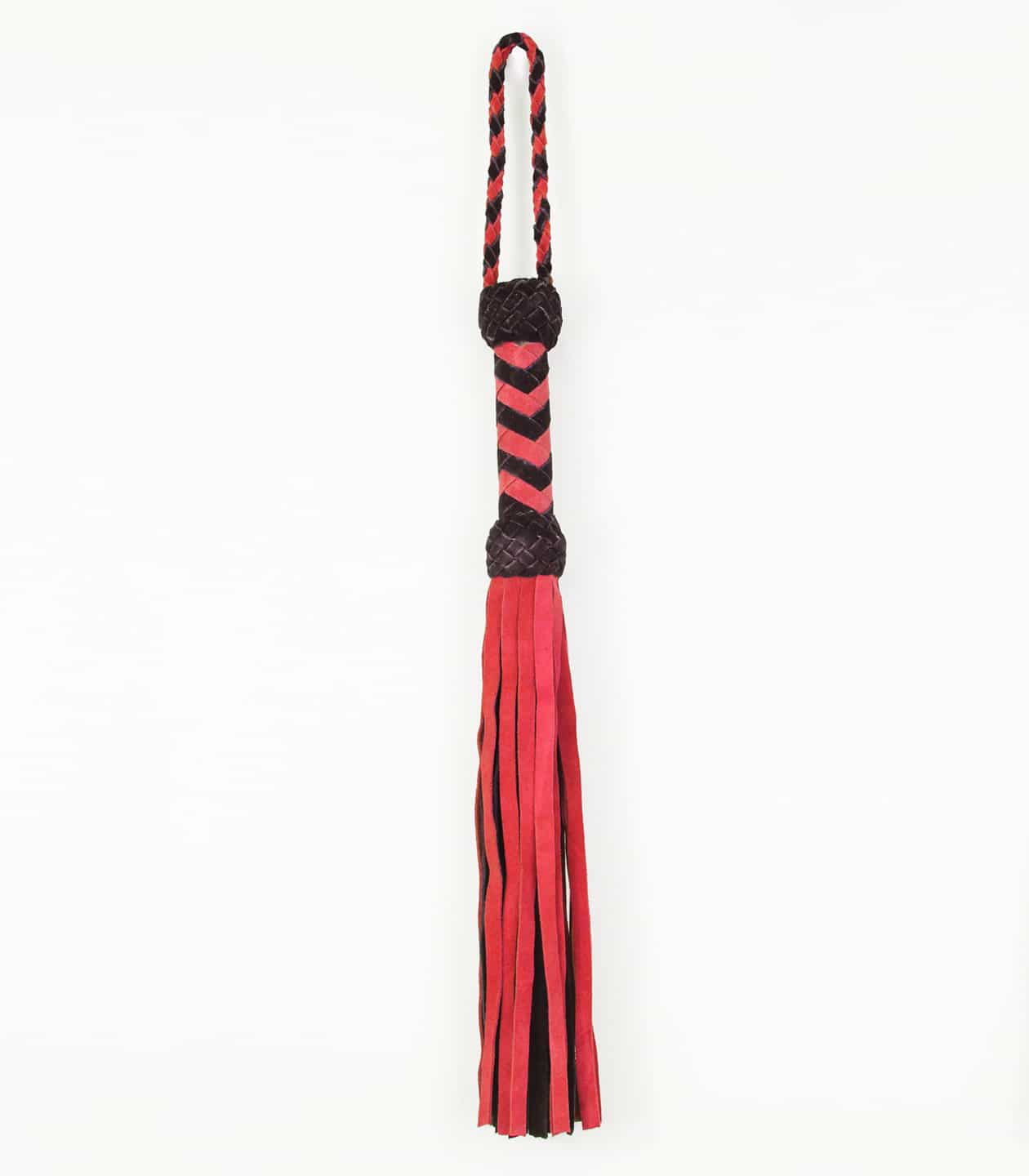Login to see priceLong suede leather flogger with turks head handle. Available in black, black + red, black + purple.