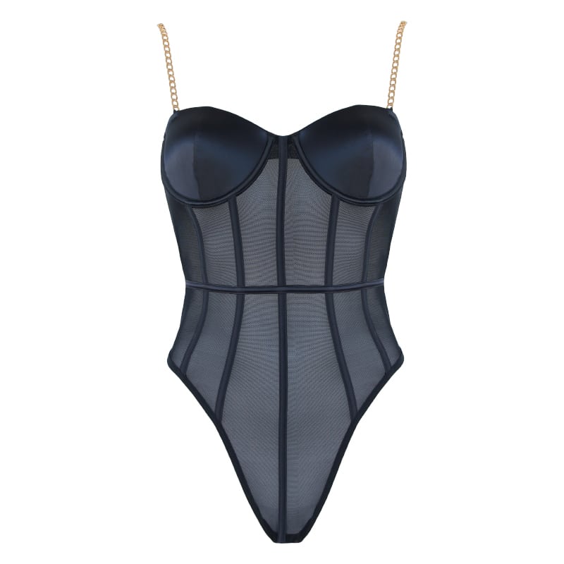 The most lusted over piece in our Muse collection, this lingerie bodysuit makes a true statement. The black mesh, one piece features gold metal chain straps that adorn the shoulders, binding to accentuate the waist, and satin covered, padded, underwire cups. Turnaround and its just as sexy- with a cutout in the lower back and an extra supportive 4-hook bra closure. Wear this piece in the sheets or on the streets under jeans or a skirt!