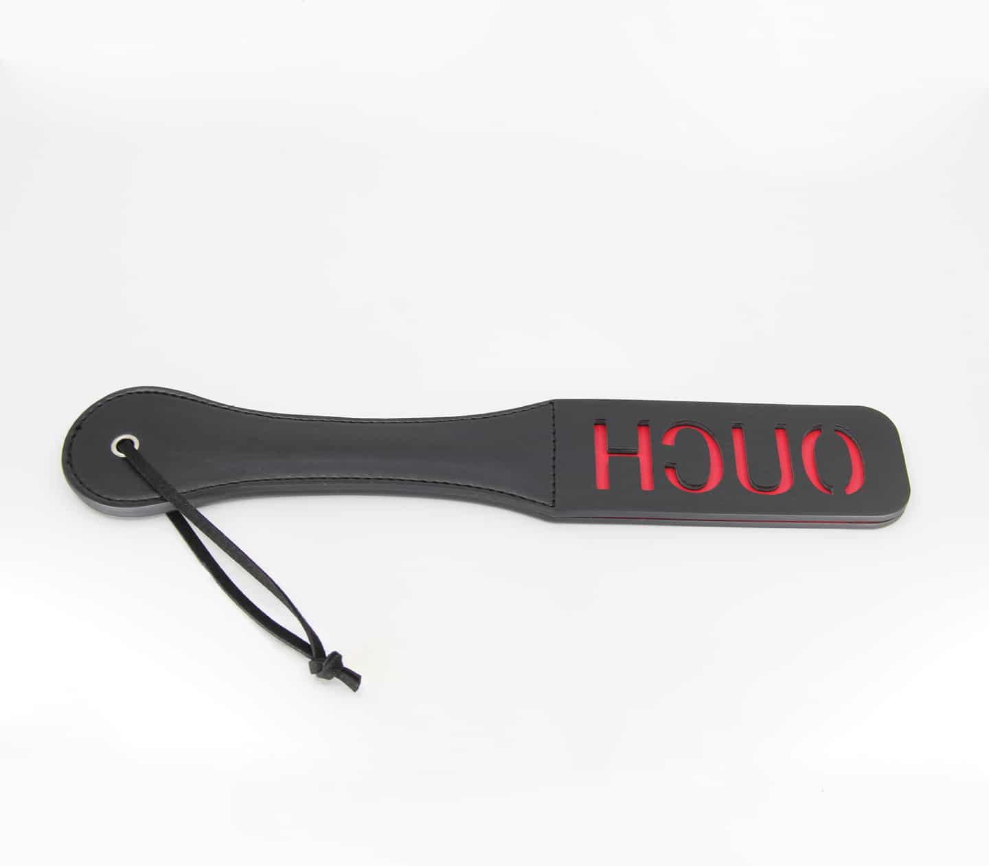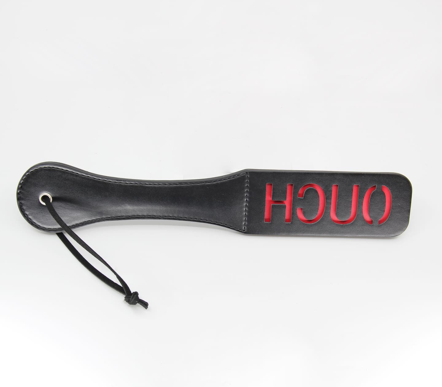 Login to see priceBlack faux leather slapper paddle with ‘Ouch’ cut out design.