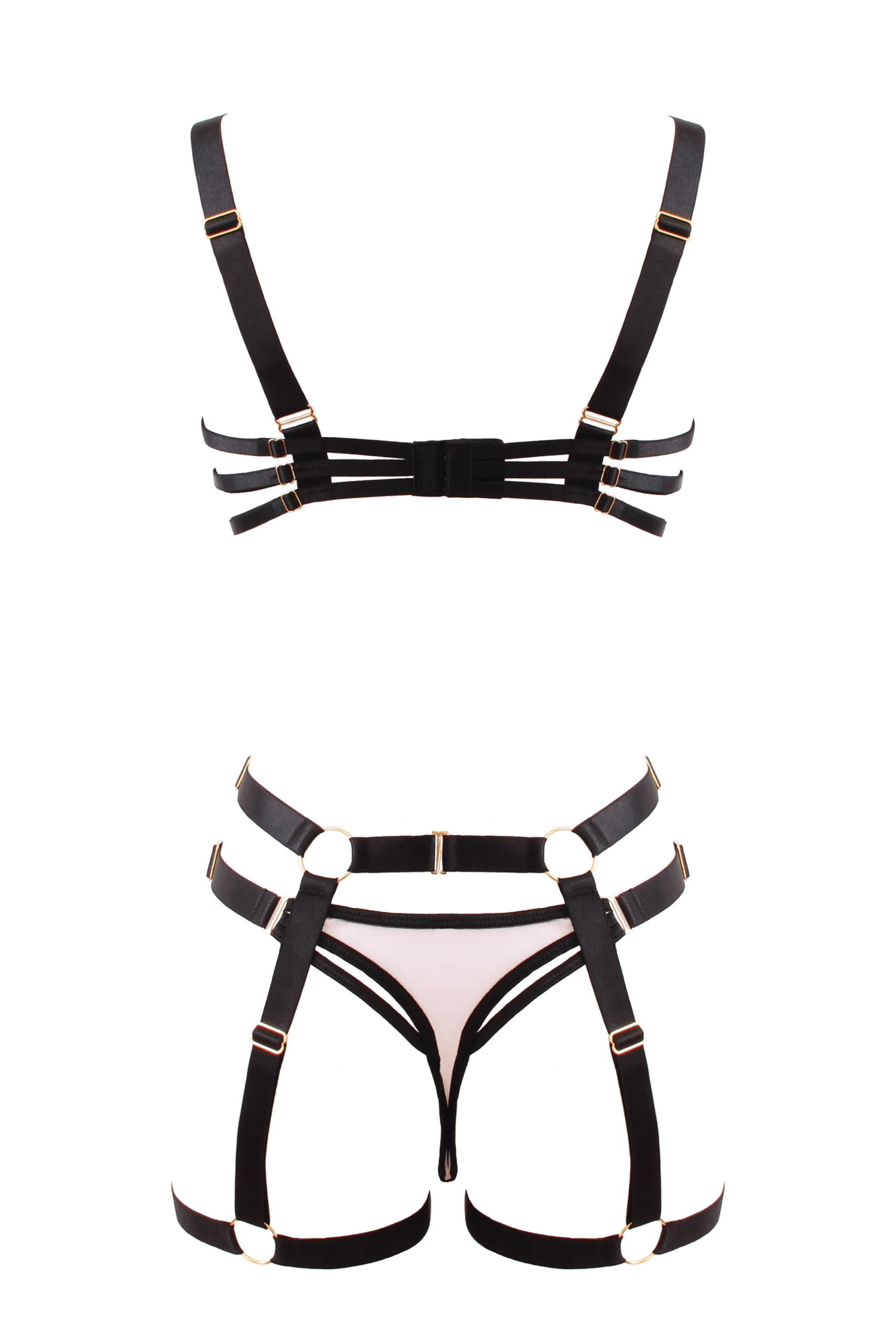 Contrast nude & black bra & panty set with elastic leg garter belt