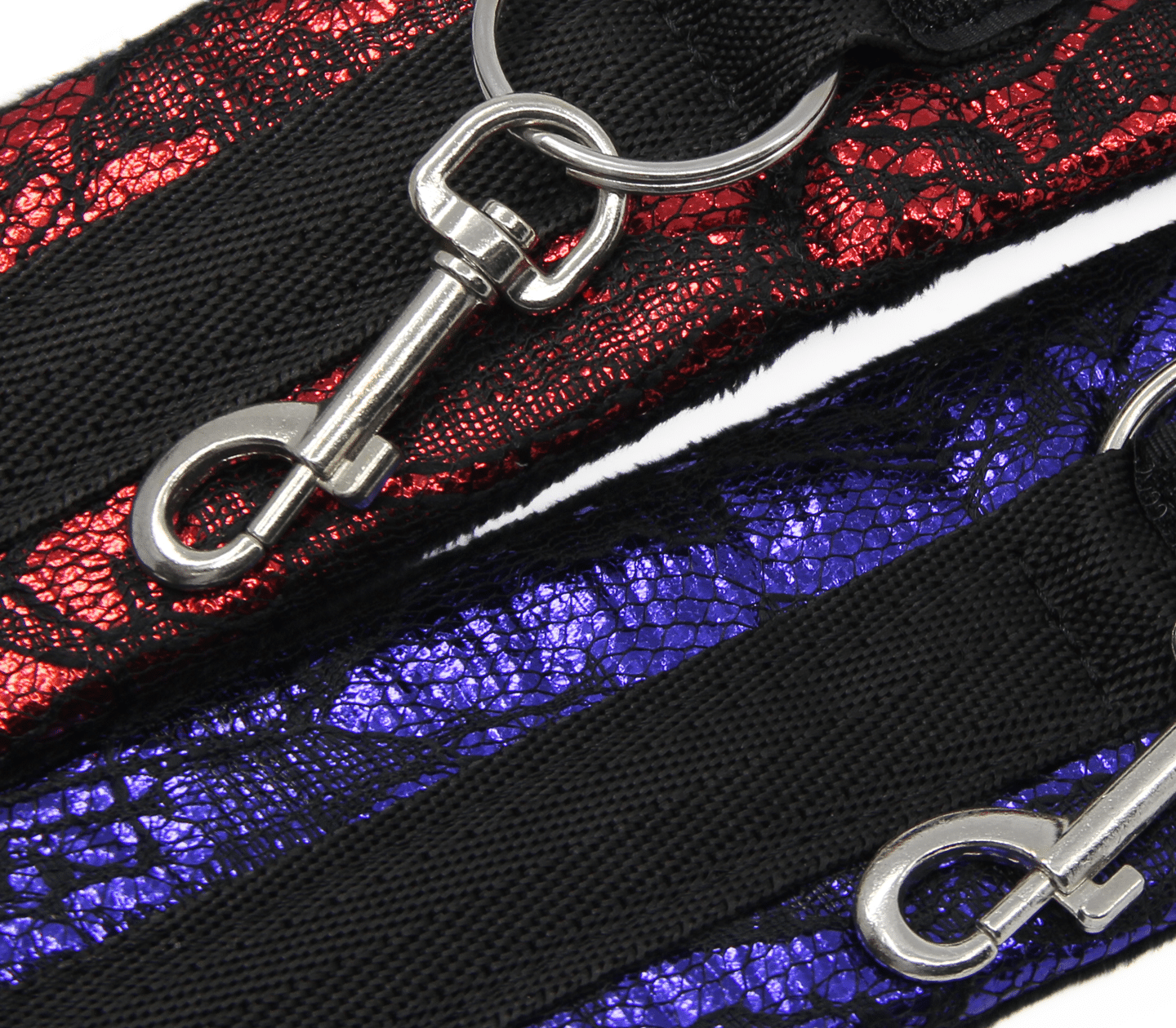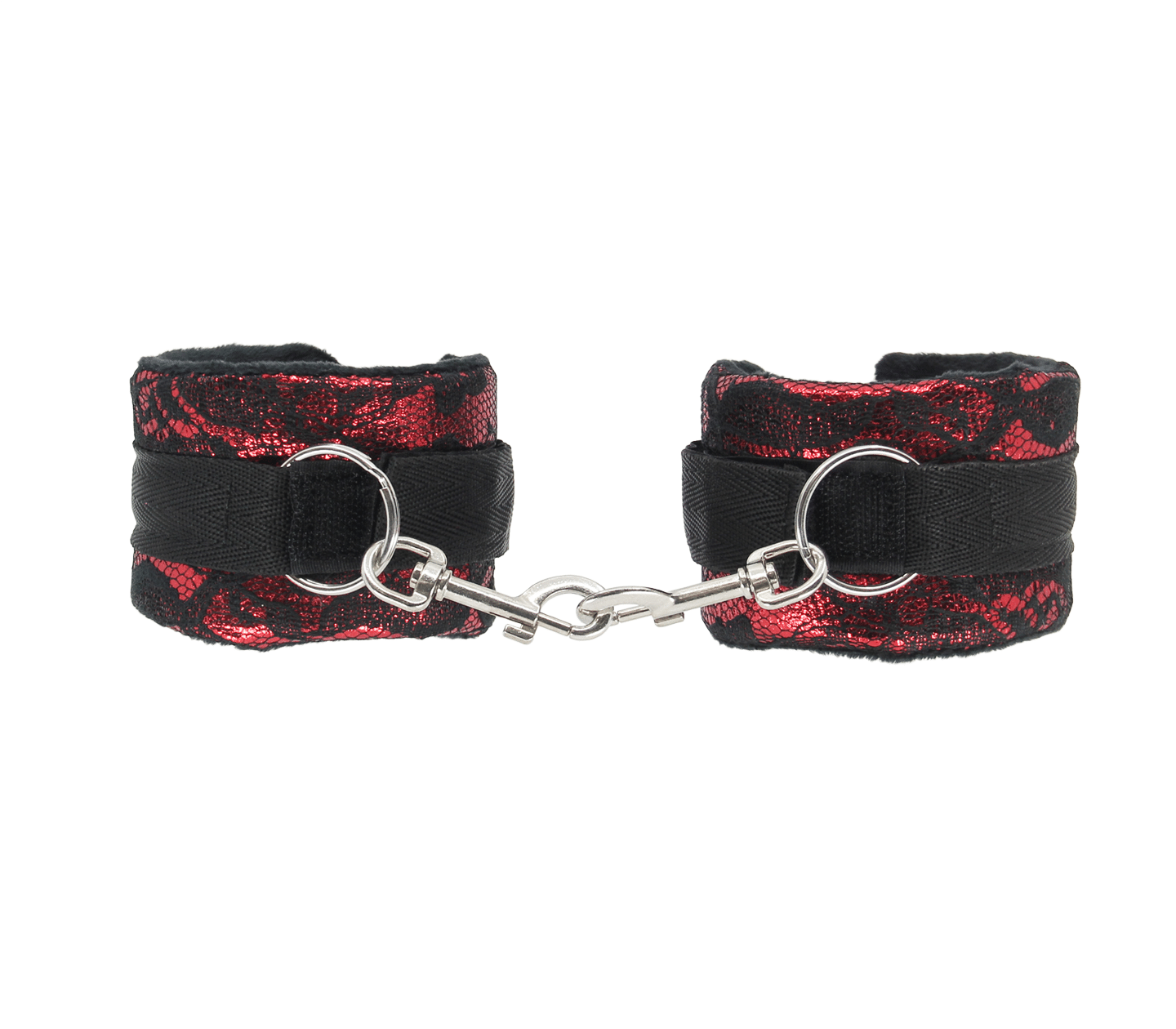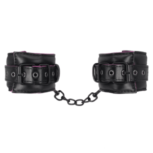Login to see priceBright satin wrist cuffs covered in luxurious lace and lined with plush fabric. Available in purple and red.